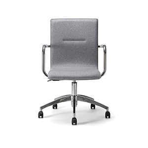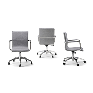 Frame: chrome, powdercoat. Seat & Back: Upholstered in custom leather or fabric. Available with or without wheels, and in an adjustable option.