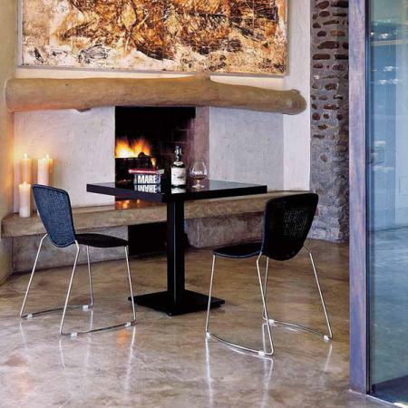 Steel dining chair with a sled frame. Suitable for indoor use.