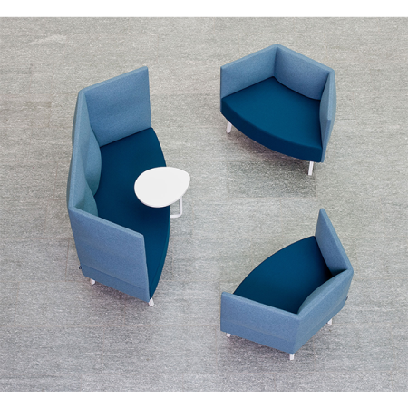 A place for retreat in an office or a lobby. High backrests of the sofa and a rotating table are designed to create a private area for work or relaxation. The two-seater version with one or two tables is perfect for inviting a colleague to join you. Wide variety of original options for arranging individual segments into groups.