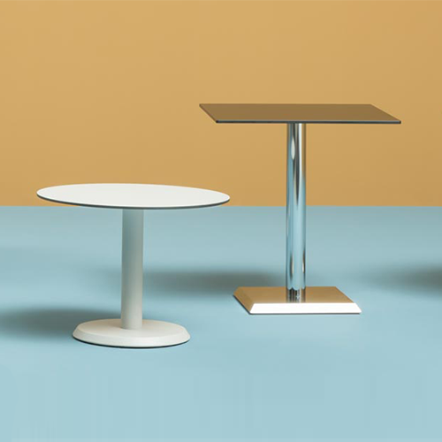 Base: brushed stainless steel base mm 420×420 and solid beech column stained wengé colour with brushed stainless steel collar. Maximum recommended top mm 800×800.