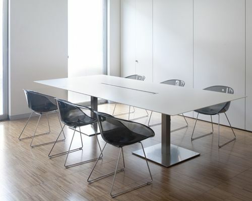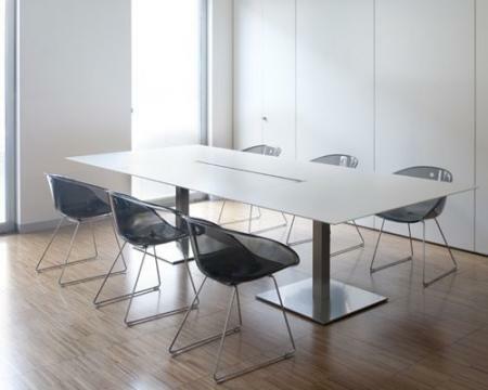 Base: round or square brushed stainless steel table bases. Desk cable management in extruded aluminium as an option.